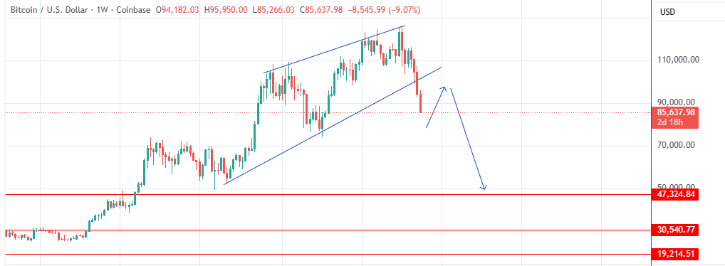 Technical Breakdown Confirmed: Bitcoin has broken down from a significant Rising Wedge pattern on technical charts—a key bearish reversal signal. The resulting target is the wedge's base, which aligns with the structural $50,000 level. Expect the market to take several months to potentially reach this next major structural support.